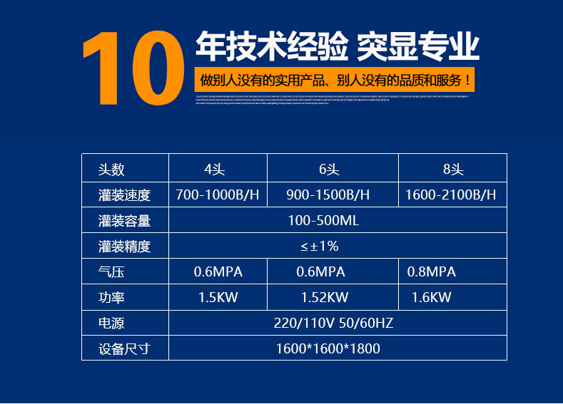 設備型號 | 灌裝速度 | 灌裝容量 | 灌裝精度 | 氣壓 | 功率 | 電源 | 設備尺寸 |
