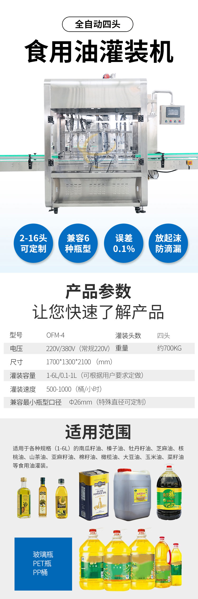 適用于各種規格(1-6L)的南瓜籽油、榛子油、牡丹籽油、芝麻油、核桃油、山茶油、亞麻籽油、棉籽油、橄欖油、大豆油。