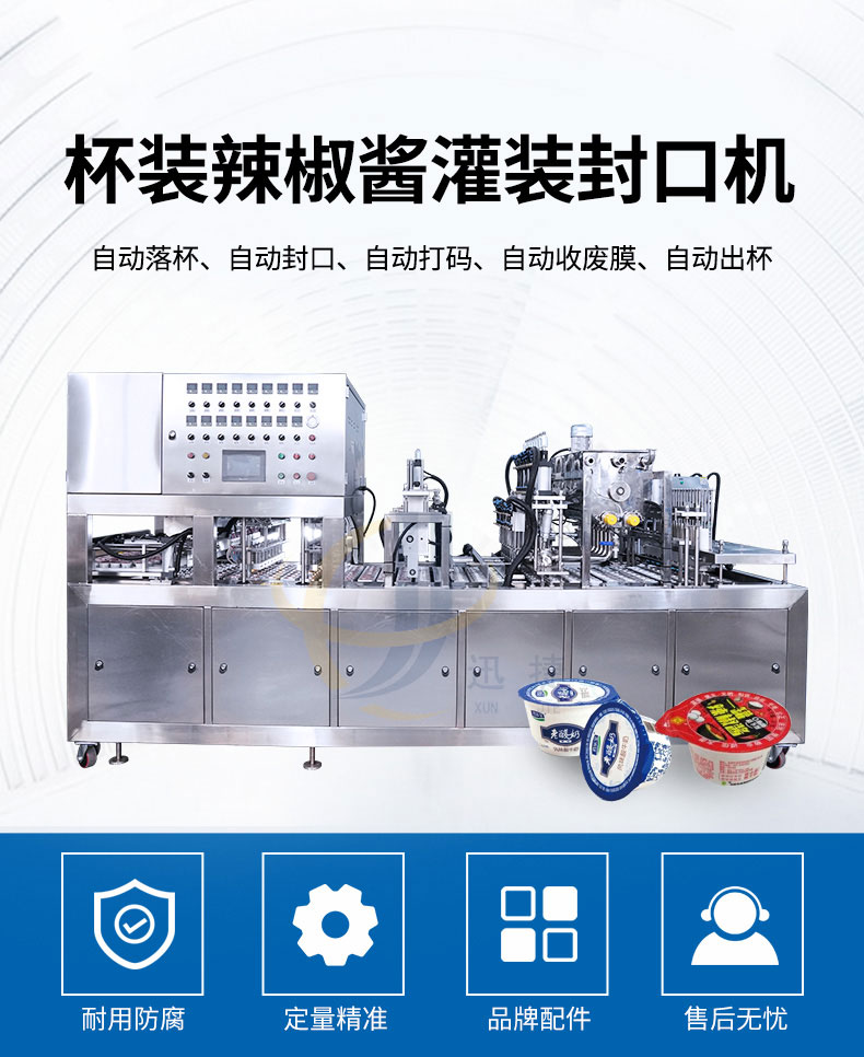 杯裝辣椒醬灌裝封口機適用于辣椒醬、黃豆醬、豆瓣醬、牛肉醬、沙拉醬等各種杯裝、盒裝等產(chǎn)品的生產(chǎn)。