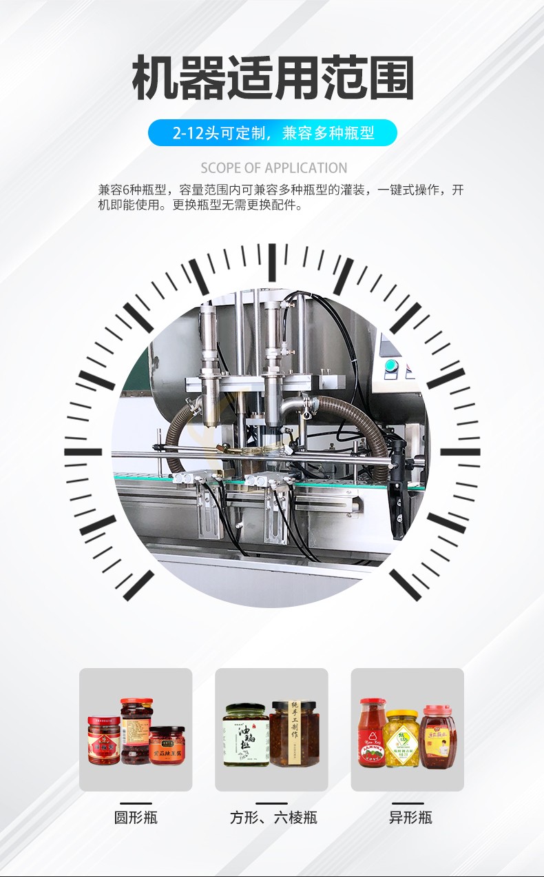 全自動(dòng)雙頭醬料灌裝機兼容6種瓶型,容量范圍內可兼容多種瓶型的灌裝,一鍵式操作,開(kāi)機即能使用。更換瓶型無(wú)需更換配件。