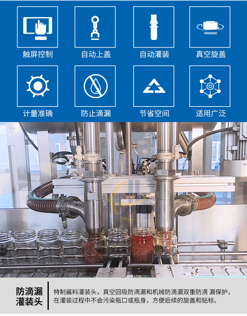 小型醬料灌裝生產(chǎn)線(xiàn)適用于調味品中帶顆粒并且濃度較大的香菇醬、辣椒醬、豆瓣醬、花生醬、芝麻醬、果醬、牛油火鍋底料