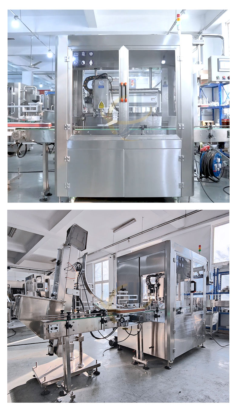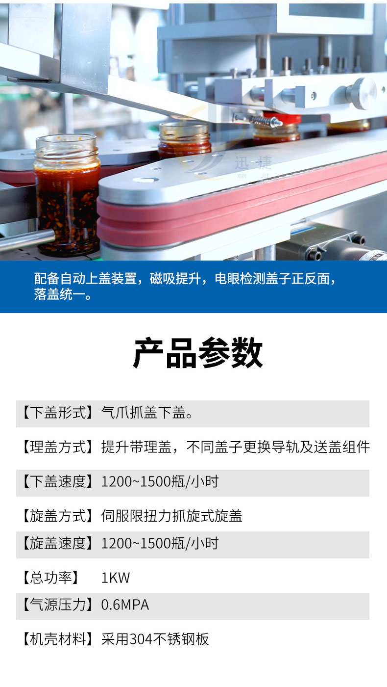 跟蹤式真空旋蓋機適用于多種瓶型的馬口鐵蓋真空旋蓋。設備由PLC結合觸摸屏控制,采用世界知名品牌電器和氣動(dòng)元件,故障率低。