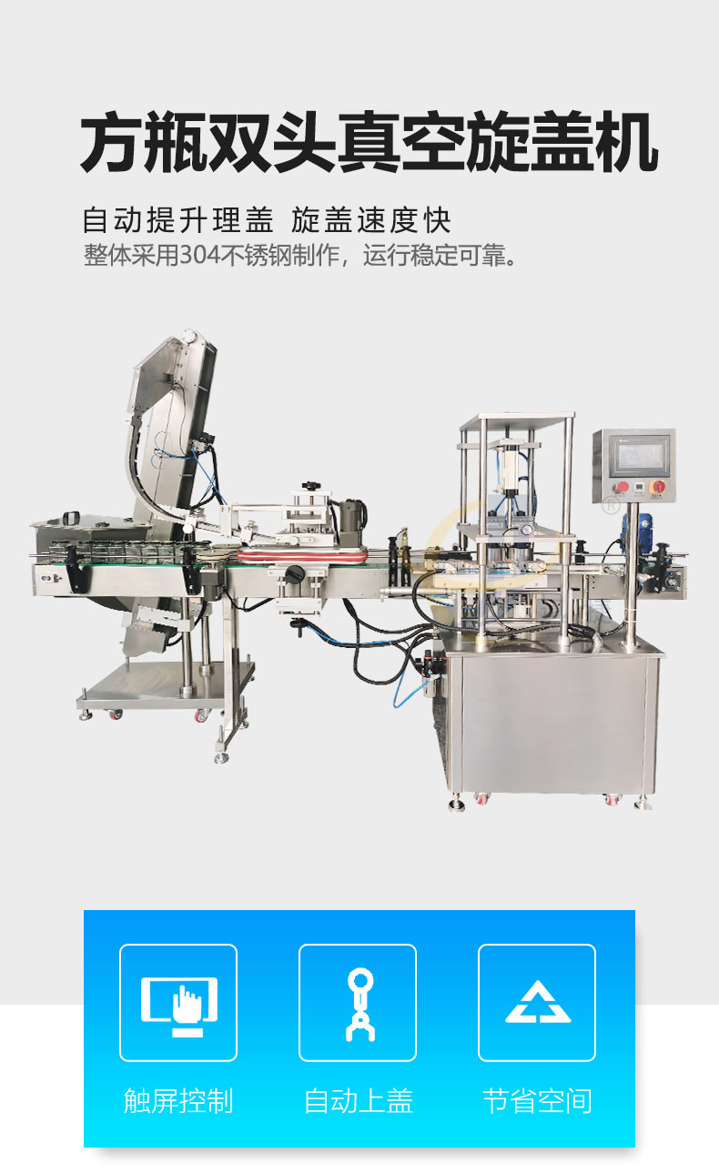 方瓶雙頭真空旋蓋機獨特的設計,可兼容多種不同形狀,尺寸的瓶子旋蓋,兼容性強,且調整方便;真空壓力可調,觸摸屏人機界面操作簡(jiǎn)單方便。