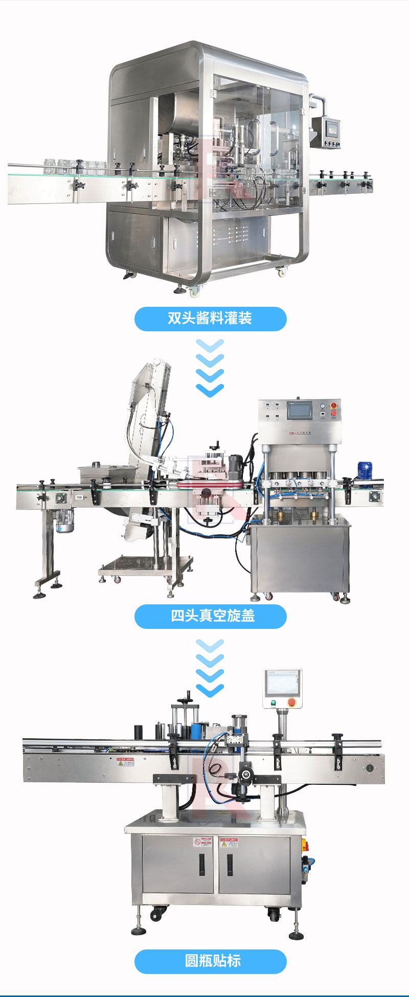 雙頭辣椒醬灌裝生產(chǎn)線(xiàn)適用于調味品中帶顆粒并且濃度較大的香菇醬、豆瓣醬、花生醬、芝麻醬、果醬、牛油火鍋底料等醬類(lèi)的灌裝。