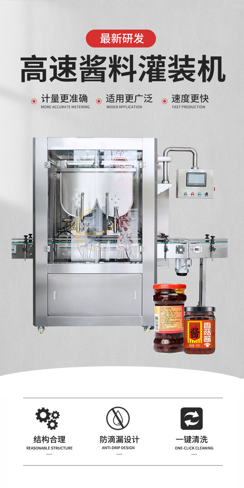 雙頭高速醬料灌裝機適用于調味品中帶顆粒并且濃度較大的辣椒醬、豆瓣醬、花生醬、香菇醬、果醬、牛油火鍋底料。