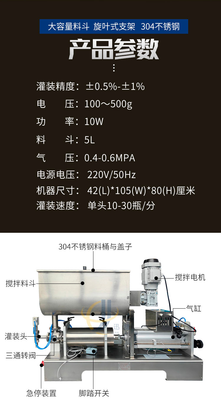 本灌裝機采用臺灣正品亞德客氣缸,力度更大,效率更高!超大不銹鋼料斗,帶自動(dòng)攪拌功能,保證灌裝產(chǎn)品,使產(chǎn)品灌裝更加均勻!灌裝嘴采用鋼精制成,精確灌裝不堵塞,防滴漏設計帶產(chǎn)品自提功能,灌裝更準確!